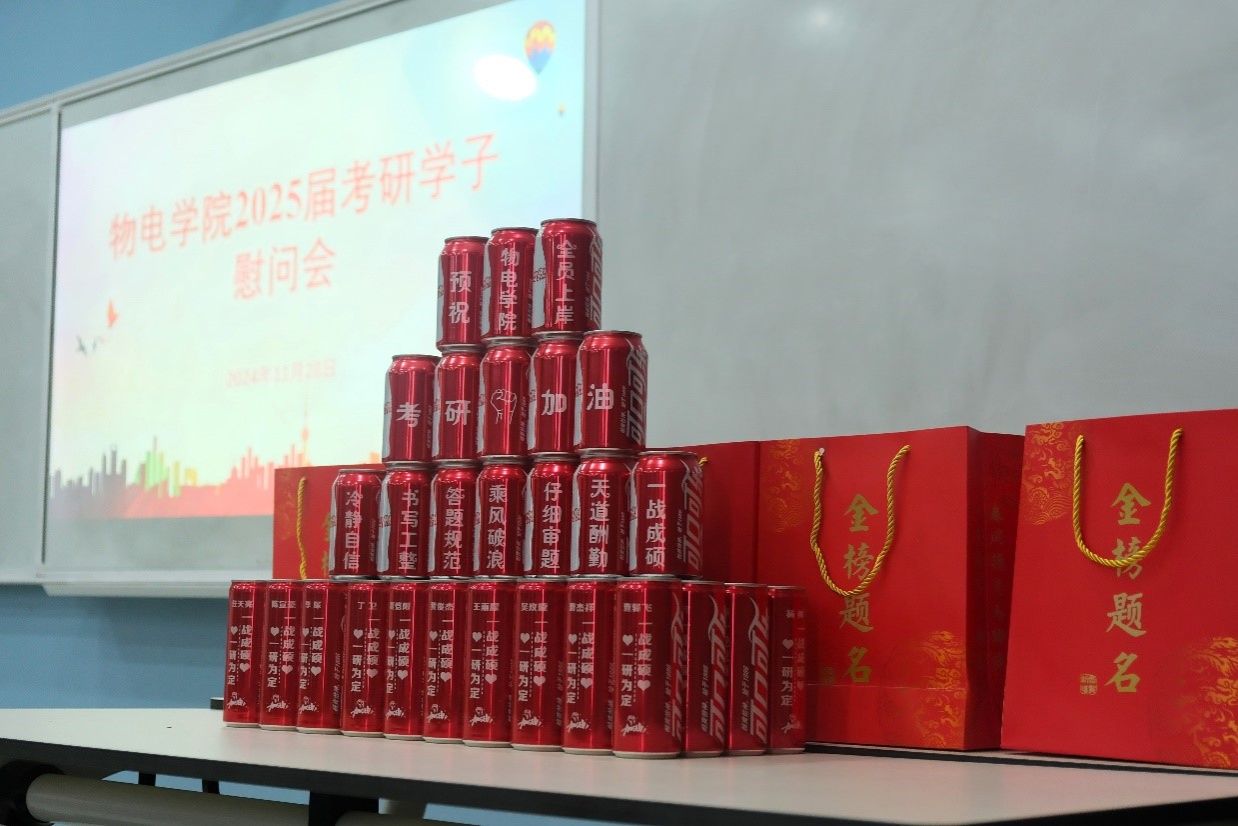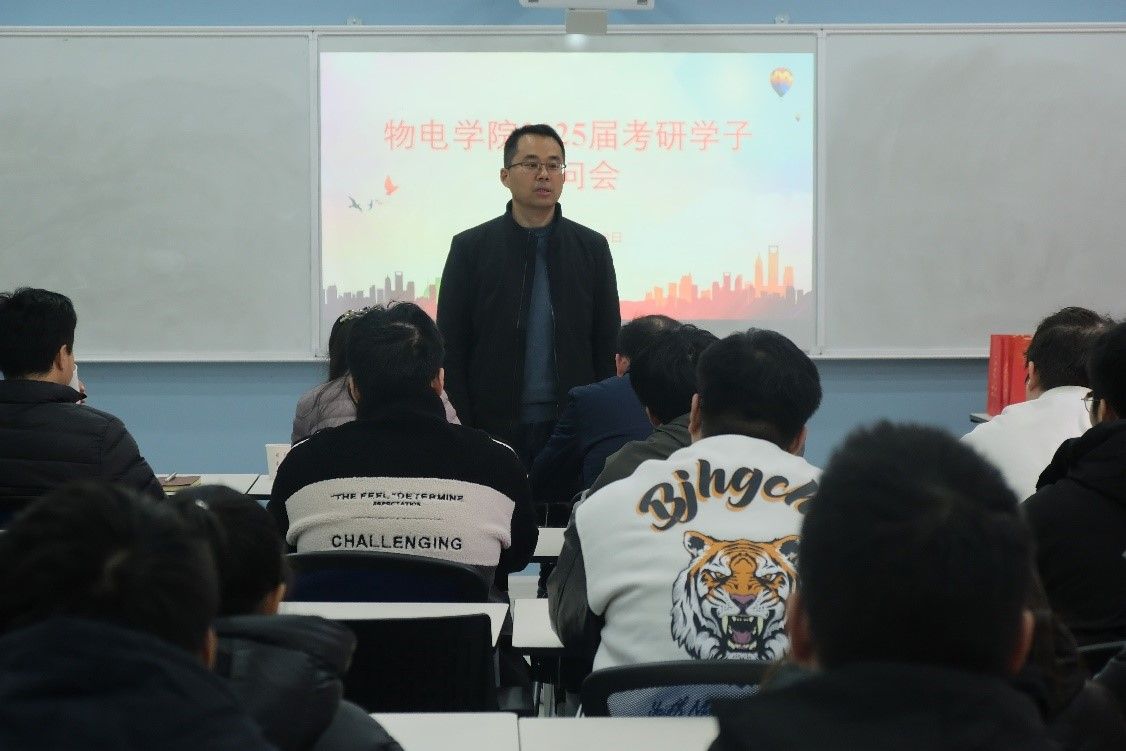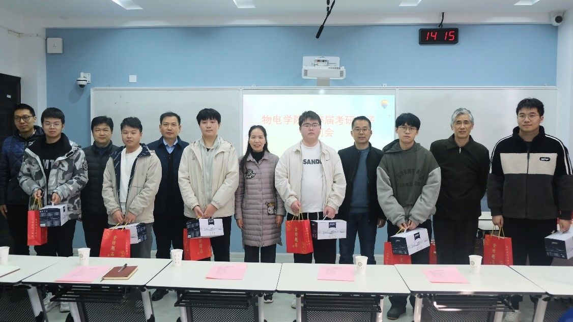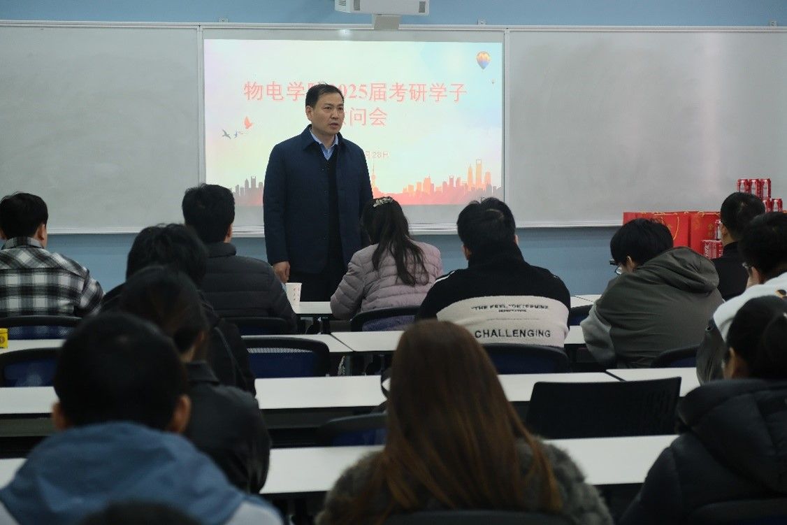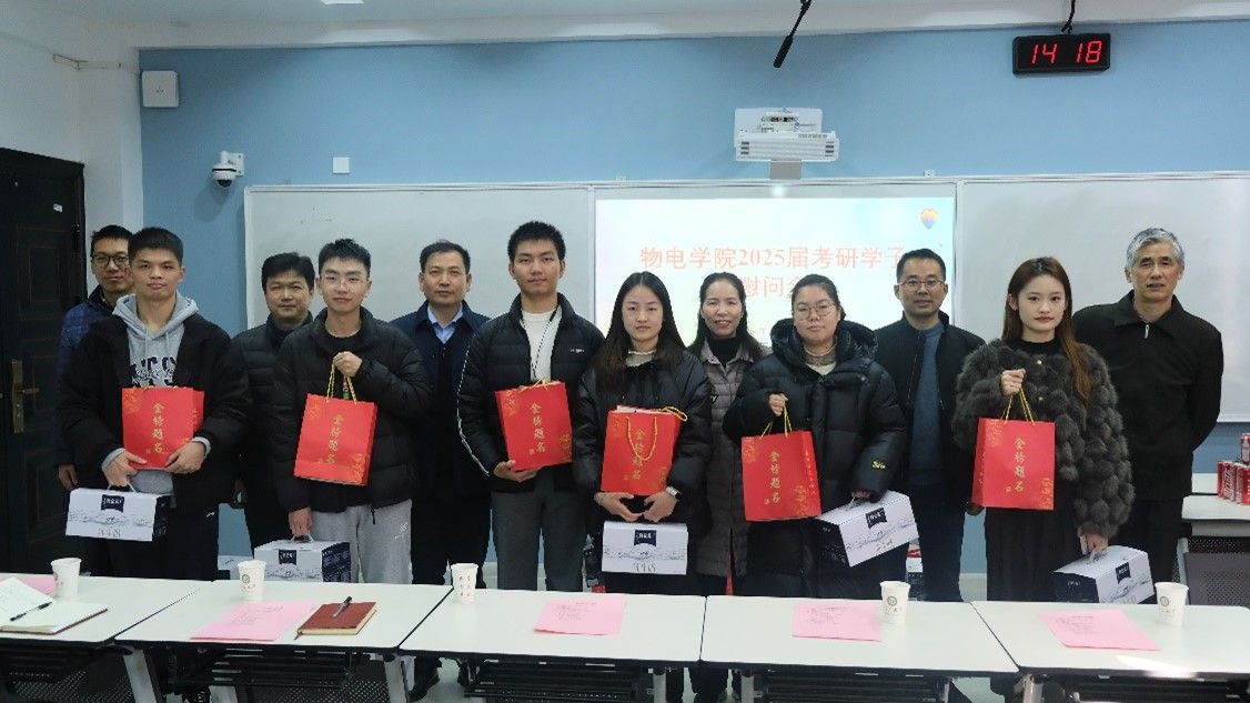 11月28日,高清AV 在三山楼802教室举办2025届考研学子慰问会。高清AV 党委书记潘金彪,党委副书记、副院长顾瑜婷,副院长徐晶,物理系主任尚学府,微电子系党支部书记刘圆,关工委委员陆正兴,辅导员刘振、杨伟伟参加本次活动,共同为即将踏上考场的考研学子们加油鼓劲。