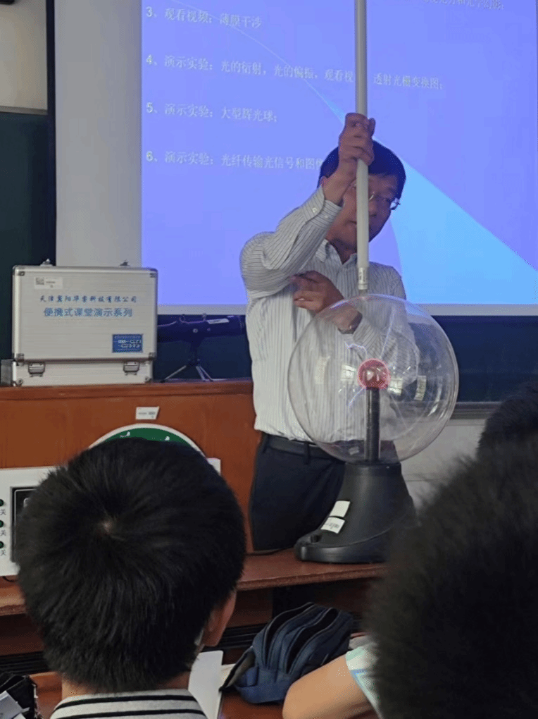 陶根宁老师结合自己多年的教学经验与科研积累,从中学生熟悉的日常现象出发,通过生动有趣的实例和通俗易懂的语言,系统讲解了电磁学的基本概念与重要原理。讲座中,他巧妙借助图片、动画和简易实验演示,将抽象的电场、磁场理论转化为直观可感的科学现象,引导学生逐步认识电磁感应、电磁波等核心知识,并联系手机通信、电力传输、磁悬浮等现代科技应用,展现了电磁学在推动社会发展中的重要作用。
