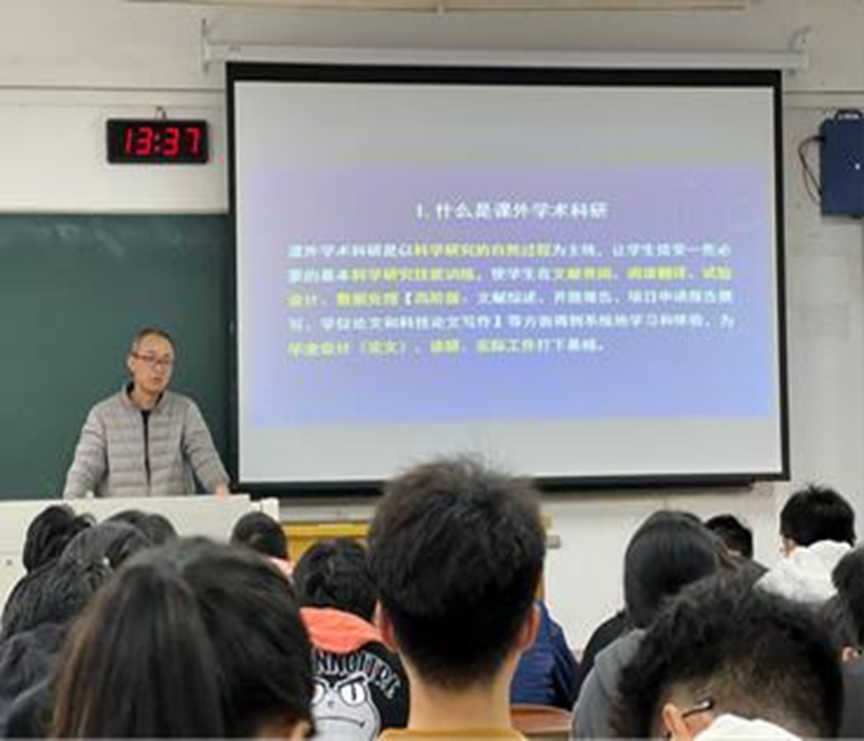 讲座中,陈明明老师首先从当前社会实际出发,分析了社会对复合人才需求的原因,表示满足社会需求的复合人才应该具备解决问题能力、创新创业能力等各方面的综合素质。然后,陈老师详细介绍了大学生参与课外学术科研活动的过程及其对学生的分析和解决问题、思维开拓、创新能力等能力培养的促进作用。最后,陈老师殷切希望同学们能够开阔视野,积极进取,顺时发展,不断提升自己的创新创业能力与解决实际问题的能力,成长为符合社会需求的高层次人才。