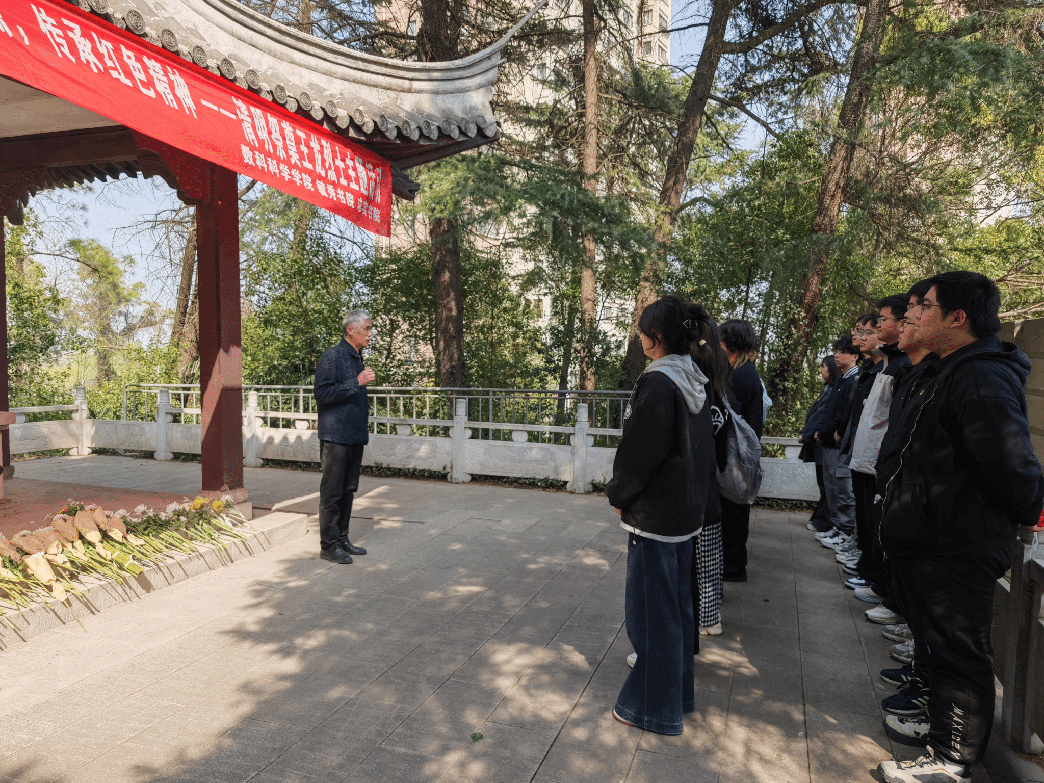 丰碑长在,英魂永存。师生代表怀着崇敬之情,整齐列队于王龙烈士纪念碑前,追思革命先烈的丰功伟绩,表达对逝去英雄的无尽怀念。在庄严肃穆的纪念碑下,高清AV 关工委陆正兴老师为同学们讲述了王龙烈士的英勇事迹。陆老师号召物电学子,要以先烈们为榜样,树立远大理想,努力掌握科学文化知识,提高自身综合素质,为将来投身祖国建设做好充分准备,做一个有道德、有情怀、有担当的新时代青年。