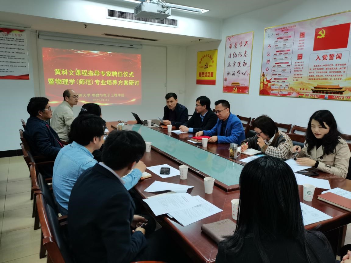 421日下午,黄科文课程指导专家聘任仪式及物理学(师范)专业培养方案研讨会在301会议室举行。高清AV 党委书记潘金彪、常务副院长陈元平、各系部负责人,以及参与培养方案修订的相关老师参加了此次会议,会议由院党委书记潘金彪主持。