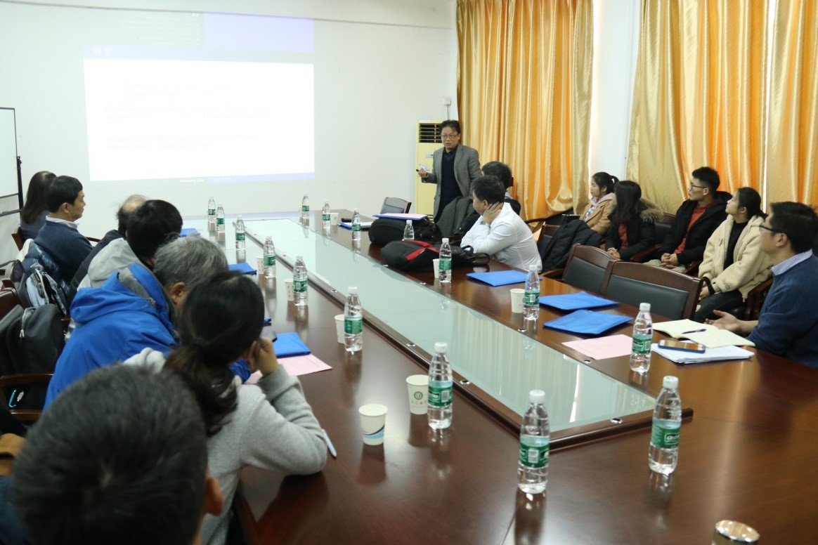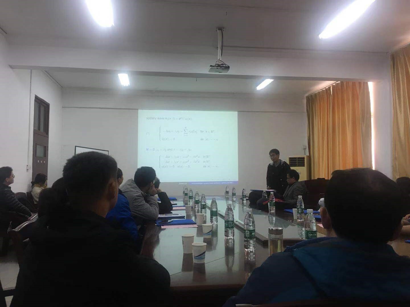 The recipient of the National Fund for Distinguished Youth, a Distinguished Professor of Changjiang Scholars Prof. Liu Zhaoli from Capital Normal University, gave an academic report entitled "A Schrodinger System from nonlinear optics and Bose-Einstein condensation". He introduced the physical background of Schrodinger system, the existence and polysolvingness of the solutions and the related works.