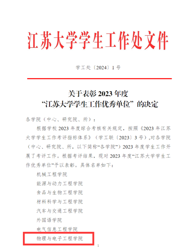 On January 3rd, the university announced the results of the 2023 annual student affairs assessment, and the College of Physics and Electrical Engineering was once again honored with the title of "Excellent Unit in Student Affairs" at Jiangsu University. As a result, the college has now been recognized as an excellent unit for four consecutive years.